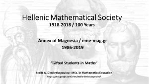 Η Πρόεδρος του Παραρτήματος Μαγνησίας της Ελληνικής Μαθηματικής Εταιρείας Κα Στέλλα Α. Δημητρακοπούλου παρουσίασε στους παρευρισκόμενους τα ιδιαίτερα χαρακτηριστικά των χαρισματούχων παιδιών, τους τρόπους που αυτά μαθαίνουν όπως επίσης και τις ιδιαίτερες τεχνικές με τις οποίες μπορούμε να βελτιώσουμε τους τρόπους διδασκαλίας τους. Στη συνέχεια ανέπτυξε τις δράσεις του Παραρτήματος μέσα από τις οποίες ενδυναμώνεται η μάθηση και η γνώση αυτών των χαρισματικών παιδιών. Ορισμένες από αυτές είναι: