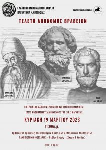 Από την Διοικούσα Επιτροπή της Ελληνικής Μαθηματικής Εταιρείας (Ε.Μ.Ε.)- Παράρτημα Ν. Μαγνησίας ανακοινώνεται ότι η Τελετή Απονομήςτων Μεταλλίων, Αριστείων & Βραβείων για το σχολικό έτος 2022-2023 θα πραγματοποιηθεί την Κυριακή 19 Μαρτίου 2023 στις 11.00 π.μ. στο Αμφιθέατρο της Σχολής Ηλεκτρολόγων Μηχανικών και Μηχανικών Υπολογιστών του Πανεπιστημίου Θεσσαλίας (Πεδίο Άρεως- Σέκερη & Χέυδεν).