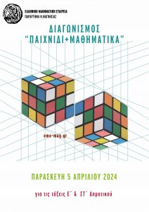 Στα πλαίσια της διεξαγωγής του 18ου Μαθητικού Διαγωνισμού «Παιχνίδι και Μαθηματικά» για τους μαθητές της Ε΄ και ΣΤ΄ τάξης του Δημοτικού Σχολείου που θα διεξαχθεί την Παρασκευή 5 Απριλίου 2023, κατά τις δυο πρώτες διδακτικές ώρες 8.15 έως 10.15, σας ενημερώνουμε ότι την αίτηση για τη συμμετοχή του σχολείου σας στο διαγωνισμό, μπορείτε να τη βρείτε και να τη συμπληρώσετε στο site της ΕΜΕ: www.hms.gr.