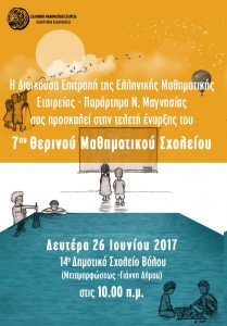 Σας προσκαλούμε στην τελετή έναρξης του 7ου ΘΜΣ τη Δευτέρα 26 Ιουνίου 2017 στις 9.45 π.μ. στο 14ο Δημοτικό Σχολείο Βόλου και στην παρακολούθηση των μαθημάτων-δράσεων από 26-30/6/2017.