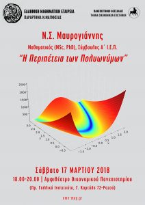 Β) στα πλαίσια των εκπαιδευτικών-επιμορφωτικών της δράσεων και με αφορμή τον εορτασμό «100 Χρόνια ΕΜΕ – 2018 Έτος Μαθηματικών» πραγματοποιεί δίωρη σεμιναριακή ομιλία το Σάββατο 17 Μαρτίου 2018 με θέμα: «Η περιπέτεια των πολυωνύμων» και ομιλητή τον κ. Νικόλαο Σ. Μαυρογιάννη, Μαθηματικό (MSc, PhD), Σύμβουλο Α΄ στο Ινστιτούτο Εκπαιδευτικής Πολιτικής. Το σεμινάριο απευθύνεται σε Μαθηματικούς, φοιτητές Θετικών Επιστημών, μαθητές Β’, Γ’ Λυκείου, αλλά και κατατοπισμένους μαθητές της Α΄ Λυκείου και Γ΄ Γυμνασίου, όπως και σε κάθε ενδιαφερόμενο για τα Μαθηματικά. Το σεμινάριο θα πραγματοποιηθεί στο Αμφιθέατρο του Οικονομικού Τμήματος του Πανεπιστημίου Θεσσαλίας (Πρ. Γαλλικό Ινστιτούτο, Γ. Καρτάλη 72-Ροζού) από 18.00-20.00 με ενδιάμεσο διάλειμμα. Η Δ.Ε. ευχαριστεί θερμά το Τμήμα Οικονομικών Επιστημών του Πανεπιστημίου Θεσσαλίας για τη συνδιοργάνωση των εκδηλώσεων και την παραχώρηση του αμφιθεάτρου.