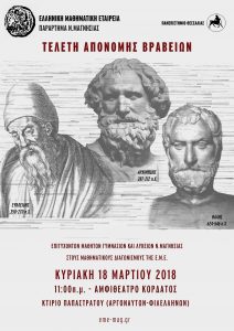 Α) την Κυριακή 18 Μαρτίου 2018 την Τελετή Απονομής Βραβείων & Τιμητικών Διακρίσεων των επιτυχόντων μαθητών των Γυμνασίων και Λυκείων του Ν. Μαγνησίας στους διαγωνισμούς της ΕΜΕ. Η Τελετή θα πραγματοποιηθεί στις 11.00 π.μ. στο Αμφιθέατρο Κορδάτος του Πανεπιστημίου Θεσσαλίας (Κτίριο Παπαστράτου, Ιάσωνος-Φιλελλήνων). Θα βραβευθούν όλοι οι μαθητές των τάξεων Β΄, Γ΄ Γυμνασίου και Α΄, Β΄, Γ΄ Λυκείου όπως και οι μαθητές του Τοπικού Διαγωνισμού της Α΄ Γυμνασίου που πέτυχαν τόσο στην πρώτη φάση του διαγωνισμού «Ο ΘΑΛΗΣ» όσο και στη δεύτερη φάση «Ο ΕΥΚΛΕΙΔΗΣ». Τα ονόματα των βραβευόμενων μαθητών είναι αναρτημένα στο site του Παραρτήματος eme-mag.gr. Την εκδήλωση θα προσφωνήσει ο κ. Νικόλαος Σ. Μαυρογιάννης, Μαθηματικός (MSc, PhD), Σύμβουλος Α΄ στο Ινστιτούτο Εκπαιδευτικής Πολιτικής, απευθύνοντας ένα σύντομο χαιρετισμό στους βραβευόμενους μαθητές. Η Δ.Ε. ευχαριστεί θερμά το Πανεπιστήμιο Θεσσαλίας για τη συνδιοργάνωση της εκδήλωσης και την παραχώρηση του αμφιθεάτρου.