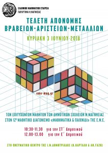 Tην Κυριακή 3 Ιουνίου 2018 πραγματοποιήθηκε η Τελετή Απονομής των μεταλλίων, αριστείων και βραβείων των επιτυχόντων μαθητών του Ν. Μαγνησίας στο διαγωνισμό “Μαθηματικά και Παιχνίδι” 2018. Η Τελετή Απονομής έγινε σε δυο βάρδιες: α) 10.30-11.30 για τους μαθητές της ΣΤ΄ Δημοτικού και β) 12.00 -13.00 για τους μαθητές της Ε΄ Δημοτικού στην κατάμεστη αίθουσα του Πνευματικού Κέντρου της Ι. Μ. Δημητριάδος (Κ. Καρτάλη & Ανθ. Γαζή). Πλήθος κόσμου μαθητές, γονείς και συγγενείς παρακολούθησαν την τελετή την οποία τίμησαν με την παρουσία τους ο Διευθυντής της Διεύθυνσης Α/θμιας Εκπαίδευσης Μαγνησίας κ. Πολύζος Γεώργιος, οι Σύμβουλοι της Α/θμιας Εκπαίδευσης Μαγνησίας κ. Σδρόλιας Κων/νος, Μαλαμίτσα Αικ. και Πατέρα Μαρία, η σύμβουλος Μαθηματικών Β/θμιας Εκπαίδευσης Μαγνησίας κ. Γκόνου Μαρία και πολλοί Διευθυντές, Υποδιευθυντές και Δάσκαλοι των σχολείων που βραβεύονταν.